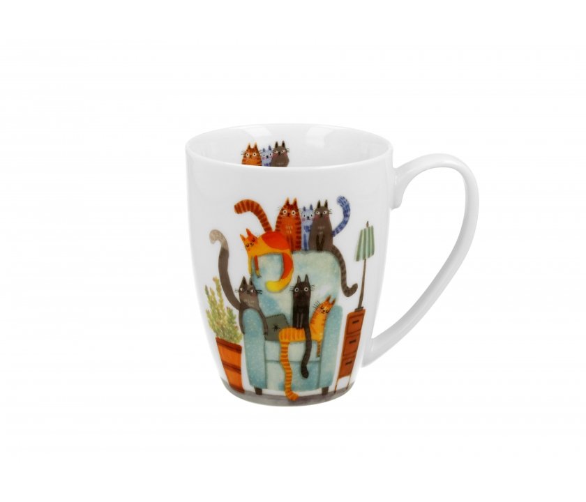 Klasický hrnek s motivem pestrobarevných domácích koček odpočívajících na velkém křesle.