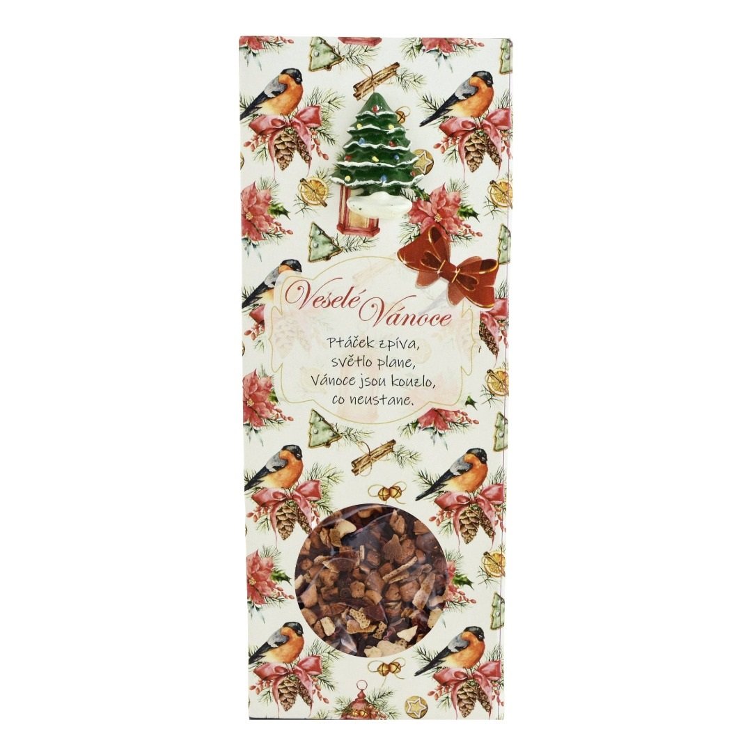 Dárková krabička s krásným motivem ptáčka sedícího na ozdobené větvičce, vánoční růže nebo hřejivé lucerny a dekorací vánočního stromku.
