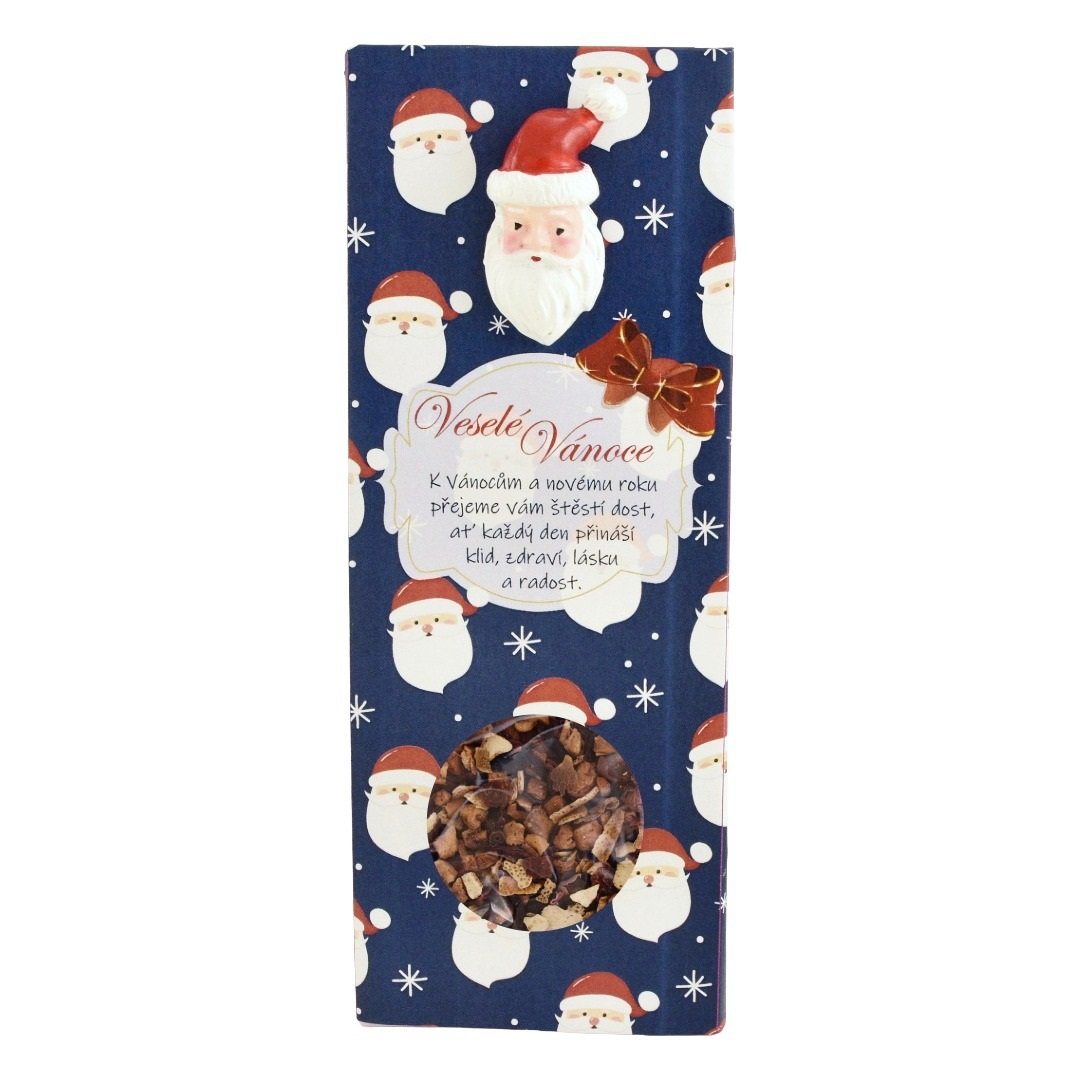 Dárková krabička s milým motivem a dekorací usměvavého Santa Clause na tvamomodrém pozadí.