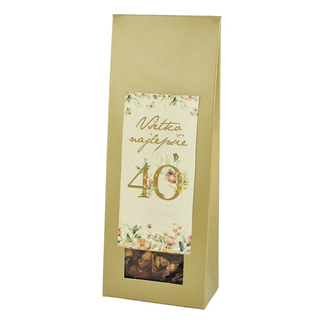 Luxusní zlatá dárková krabička s motivem velké zlaté „čtyřicítky“ obklopené jemnými květinami a motýlky, které dodávají celkovému designu elegantní a svěží vzhled.