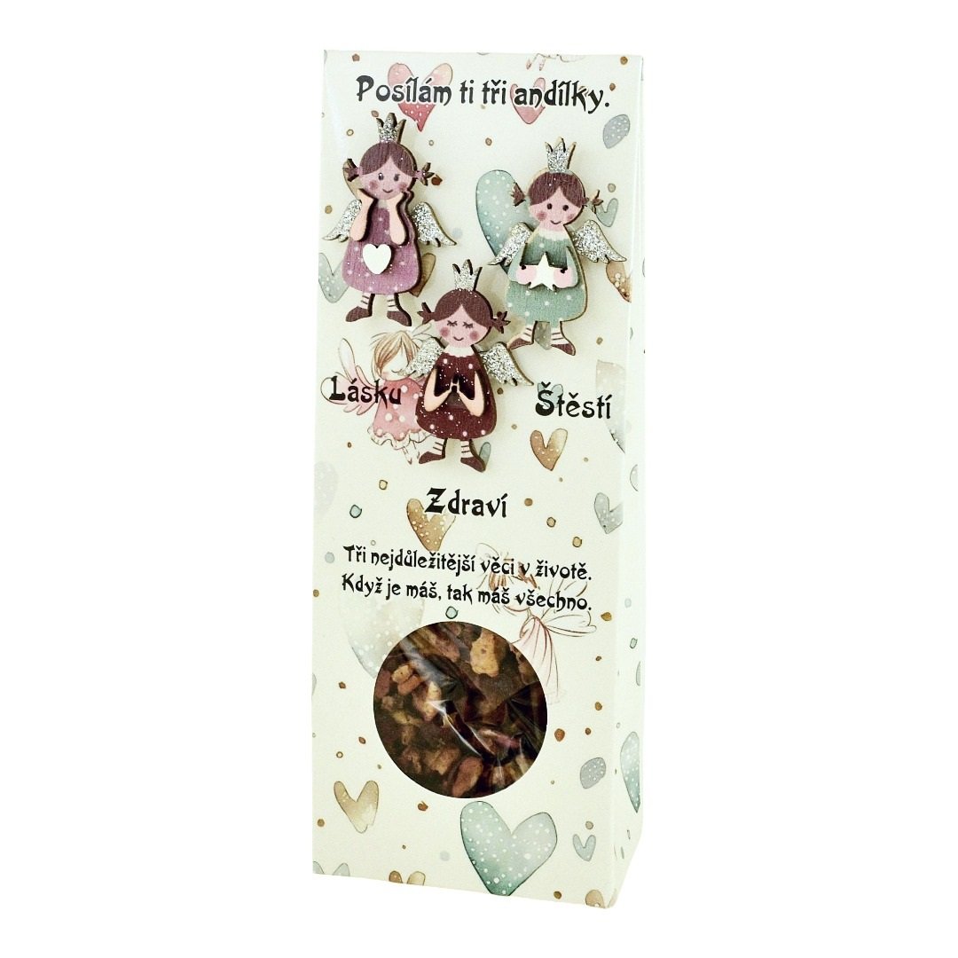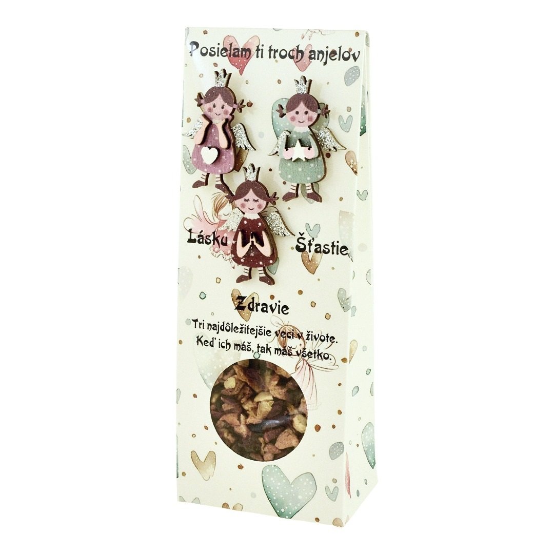 Rozkošná darčeková krabička so srdiečkovým motívom a tromi milými figúrkami anjelikov - Lásky, Šťastia a Zdravia.